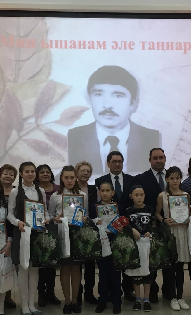 Как известно, в декабре в Центральной районной библиотеке состоялся конкурс чтецов под названием «Мин ышанам әле таңнарга», посвящённый 70-летию со дня рождения нашего земляка, башкирского поэта, прозаика и публициста, лауреата премии им.Г.Саляма Рината Магафуровича Хайретдинова.  24 января 2020 года в районном Дворце культуры прошёл вечер памяти поэта, где была организована встреча с членами Союза писателей Башкортостана, и вдовой поэта А.З.Хайретдиновой. Одним из запоминающихся моментов на мероприятии стало награждение победителей конкурса чтецов. Среди них несомненно были юные чтецы и из нашей школы. Ученицы 6 класса А.Хисамутдинова (рук. Г.А.Фахруллина) и 9 класса Э.Хабирова (рук. Д.М.Магданова) были награждены дипломами 2-ой и 3-ей степени. А учащиеся 5Б класса заслуженно удостоились диплома 2-ой степени. Все участники получили памятные призы.