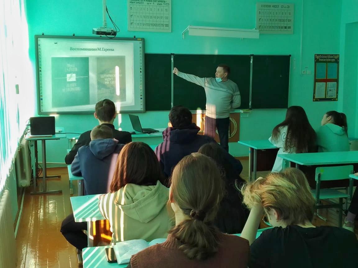 Целью данного мероприятия было воспитание чувства патриотизма, гордости за своих соотечественников,расширение знаний об истории Великой Отечественной войны,военной авиации тех лет. Преподаватель-организатор ОБЖ Хуснутдинов Салават Ришатович содержательно рассказал о героических подвигах легендарного сына башкирского народа. Старшеклассники с гордостью поделились своими знаниями о биографии лётчика, ознакомились с выдержками из личных сочинений героя, часть которых была опубликована в книге "Штурмовики идут на цель", где М.Гареев живо и увлекательно описал годы своей комсомольской юности, первые удачи и огорчения на пути к суровой, трудной профессии лётчика. Ребята с интересом и большой активностью участвовали в мероприятии и в викторине, посвящённой жизни и личности славного сына Башкортостана Мусы Гайсиновича Гареева.