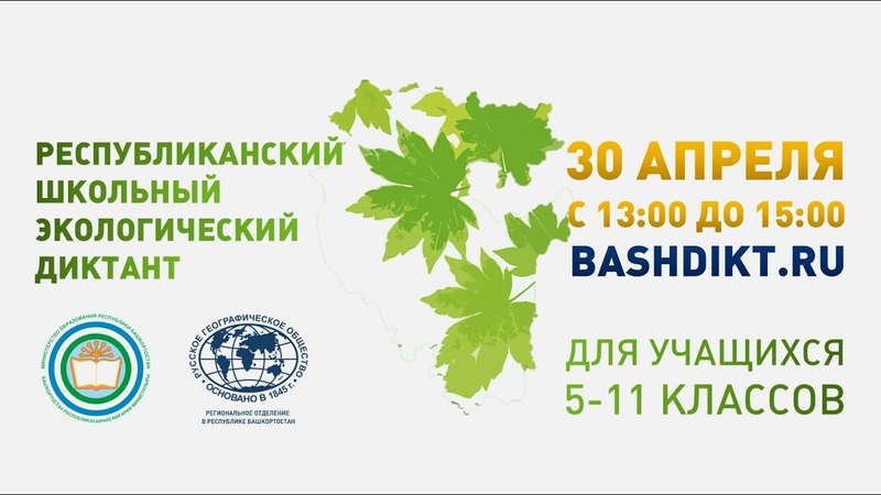 30 апреля 2020 года Министерство образования и науки Республики Башкортостан совместно с региональным отделением Русского географического общества в Республике Башкортостан проводит Республиканский школьный экологический диктант для учащихся 5-11 классов.